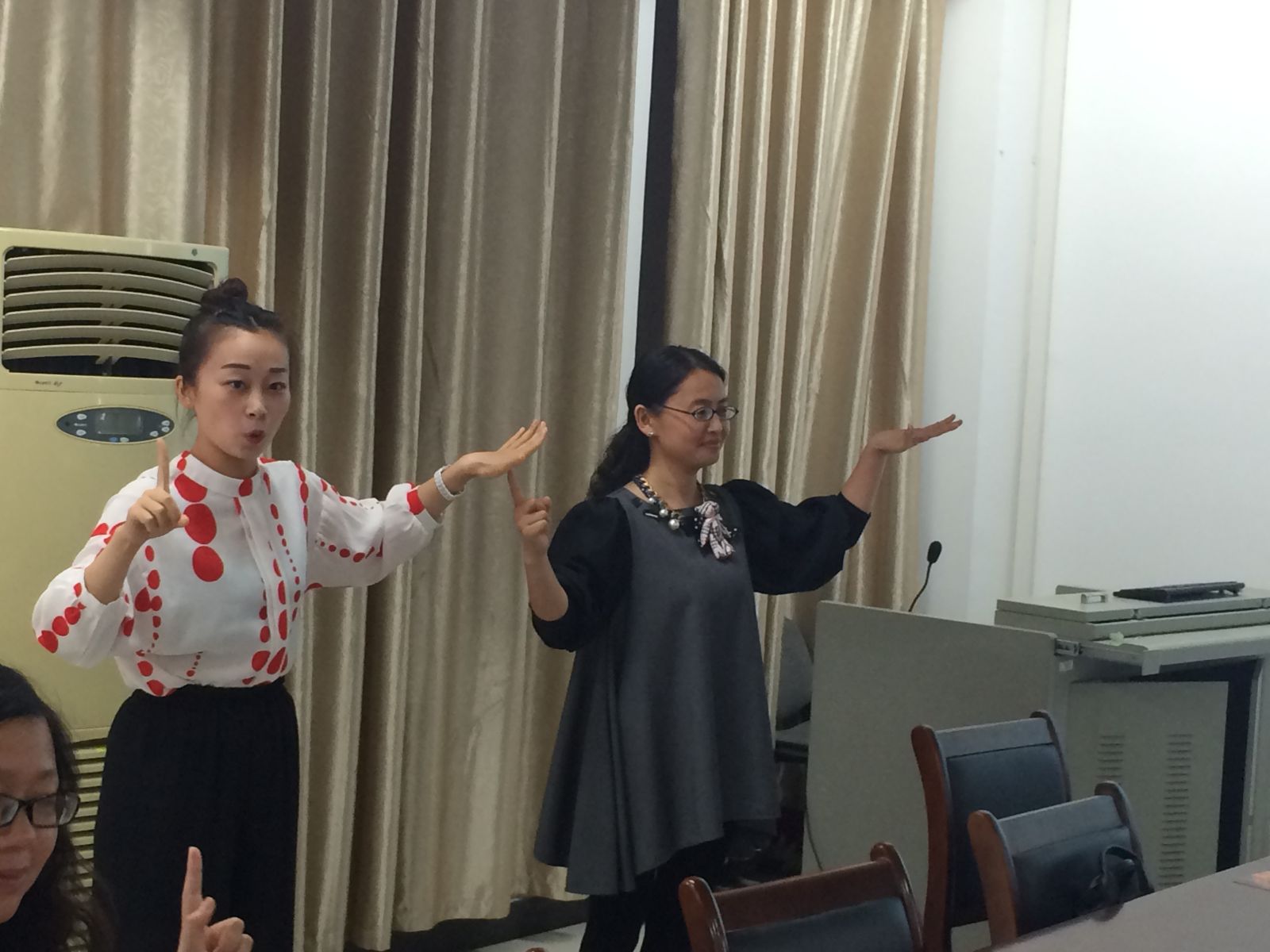 杨方(右)和助手在与卓越幼儿园教师实验班学员做互动游戏