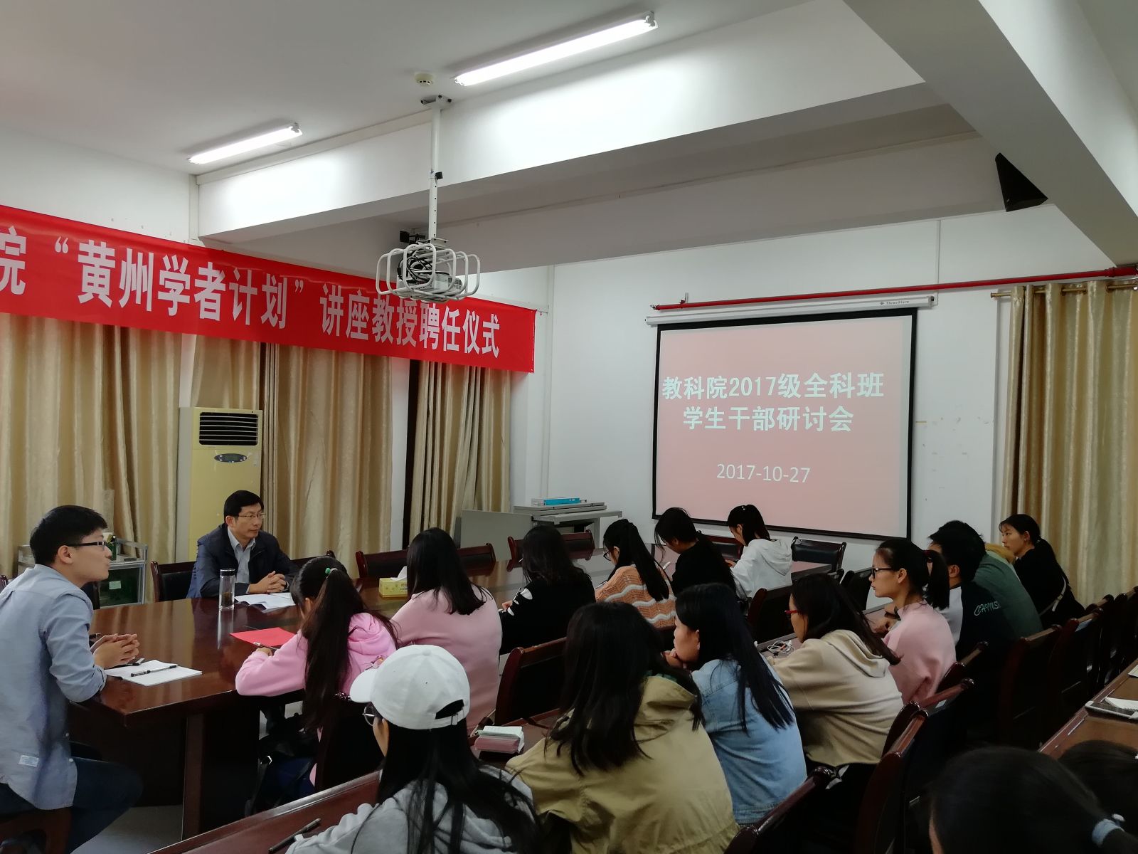 尹老师对召开本次全科班学生干部研讨会做了相应的说明,表达了学校和院系对全科班学生的期望,他从班级学生日常管理、班级学生思想引领、班级文化建设部署三方面对全科班级建设提出了建议。