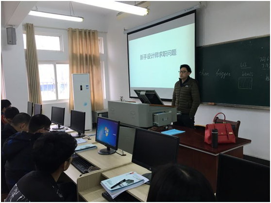 任毅刚报告的主题是新手设计师求职要注意的问题,主要从求职渠道、简历的制作、面试的技巧、选择的把握四个方面给同学们做了详细的介绍,不但使同学们对设计师行业的求职和就业有直观的认识,更使他们了解了如何求职。