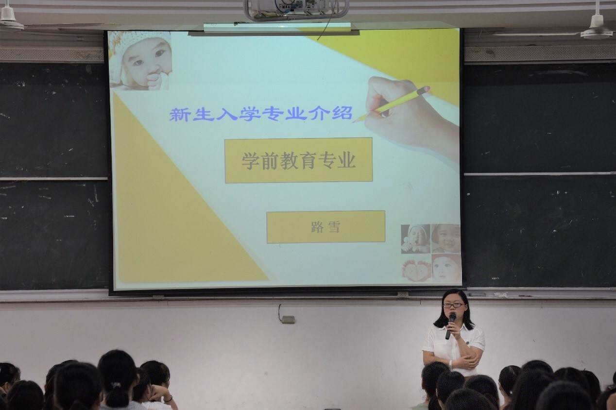 首先告诉在座新生学前教育专业的就业背景一片大好,之后介绍我校该专业的基本情况,培养规格和对于知识、能力、素质的要求。同时就大学所要学习的几门学位课程进行说明,介绍了我校该专业的教学设施以及提供的实践环节。对于未来的就业分为两大方向“就业”与“创业”,并对新生提出考证要求。最后表达了对新生的欢迎。