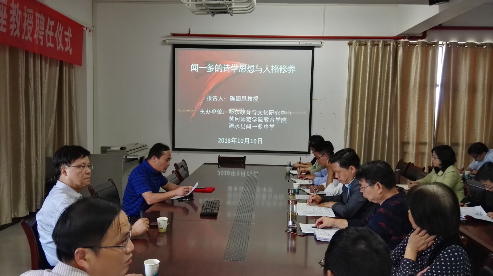 10月10日,“红烛文化进教材、进课堂、进头脑行动研究”学术研讨会在我校教育学院召开。中国闻一多研究会会长、武汉大学文学院教授、博士生导师陈国恩先生,浠水县巴河镇詹丰鸣,闻一多中学党总支书记程宝铭、校长郑细林等出席研讨会。