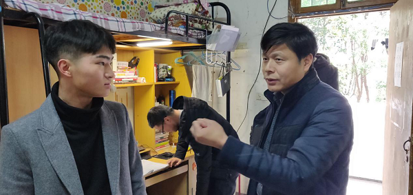2月24日下午,为深入了解学生到校情况,强调开学安全问题,教育学院党总支书记林永希、院长陈中文、党总支副书记胡周友、辅导员以及班主任走访了南北区校区学生宿舍,看望了刚刚收假的学生们。