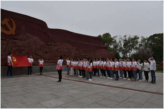 在陈潭秋故居浮雕广场前,全体成员面对党旗,高举右手,庄严宣誓入党誓词。随后又在广场上齐唱《我和我的祖国》,嘹亮的歌声慷慨激昂,振奋人心,表达了对伟大祖国的热爱和感恩之情。在陈潭秋故居居室,聆听值班人员的介绍,透过橱窗穿越时空与历史对话,回忆那段烽火岁月,怀着对革命先烈的敬仰之情,全体成员在陈潭秋铜像前合影留念并结束了此次主题党日活动。