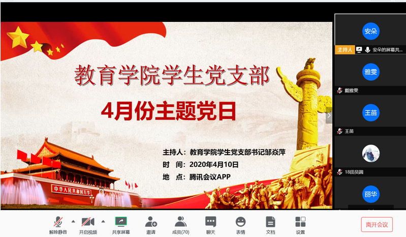 4月10日下午,william威廉中文官网学生党支部借助视频会议举行了4月支部主题党日线上学习活动。会议由学生党支部书记邹焱萍老师主持,党总支副书记胡周友老师出席,全体学生党员参加了会议。