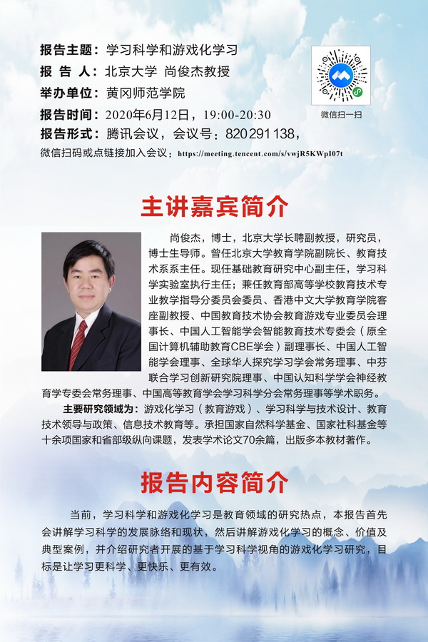 主讲嘉宾简介:尚俊杰,博士,北京大学长聘副教授,研究员,博士生导师。曾任北京大学教育学院副院长、教育技术系系主任。现任基础教育研究中心副主任,学习科学实验室执行主任;兼任教育部高等学校教育技术专业教学指导分委员会委员、香港中文大学教育学院客座副教授、中国教育技术协会教育游戏专业委员会理事长、中国人工智能学会智能教育技术专委会(原全国计算机辅助教育CBE学会)副理事长、中国人工智能学会理事、全球华人探究学习学会常务理事、中芬联合学习创新研究院理事、中国认知科学学会神经教育学专委会常务理事、中国高等教育学会学习科学分会常务理事等学术职务。