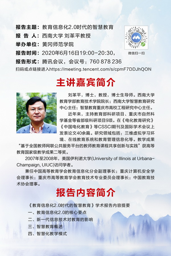 主讲嘉宾简介:刘革平,博士,教授,博士生导师。西南大学教育学部教育技术学院院长;西南大学智慧教育研究中心主任;智慧教育重庆市高校工程研究中心主任。