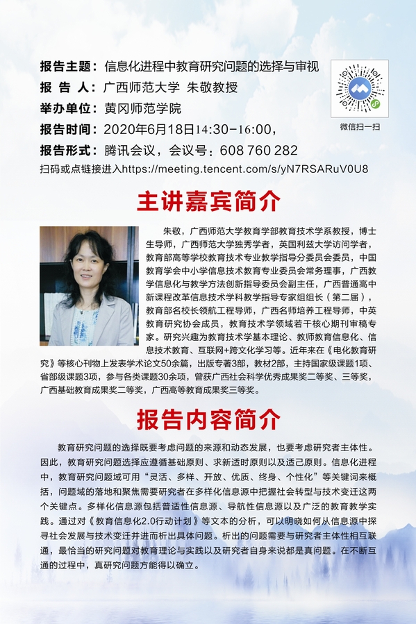主讲嘉宾简介:朱敬,广西师范大学教育学部教育技术学系教授,博士生导师,广西师范大学独秀学者,英国利兹大学访问学者,教育部高等学校教育技术专业教学指导分委员会委员,中国教育学会中小学信息技术教育专业委员会常务理事,广西教学信息化与教学方法创新指导委员会副主任,广西普通高中新课程改革信息技术学科教学指导专家组组长(第二届),教育部名校长领航工程导师,广西名师培养工程导师,中英教育研究协会成员,教育技术学领域若干核心期刊审稿专家。研究兴趣为教育技术学基本理论、教师教育信息化、信息技术教育、互联网+跨文化学习等。近年来在《电化教育研究》等核心刊物上发表学术论文50余篇,出版专著3部,教材2部,主持国家级课题1项、省部级课题3项,参与各类课题30余项,曾获广西社会科学优秀成果奖二等奖、三等奖,广西基础教育成果奖二等奖,广西高等教育成果奖三等奖。