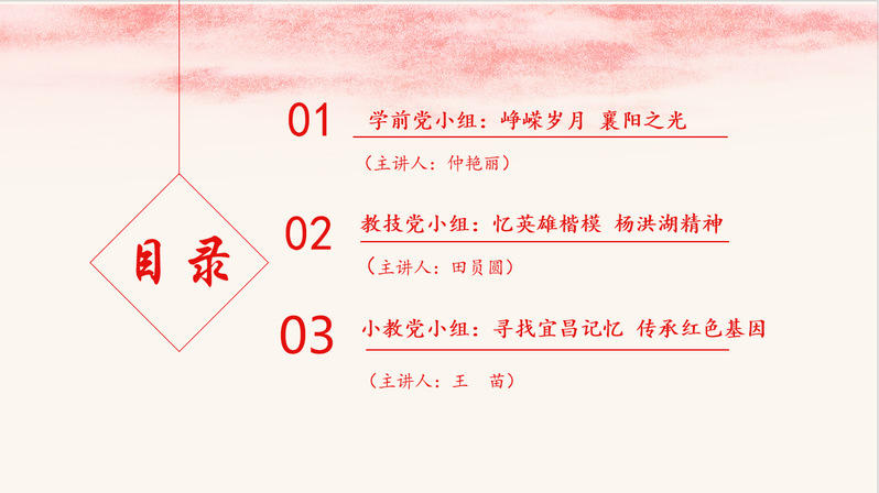 此次党课由学生党员王苗、仲艳丽、田员圆主讲。他们分别代表小教、学前、教技3个党小组,以《寻找宜昌记忆,传承红色基因》、《峥嵘岁月,襄阳之光》、《忆英雄楷模,扬洪湖精神》为题,围绕着自己的家乡,探寻家乡的“红色记忆”,从红色奋斗故事、重要红色景点和模范先进党员三个方面向与会人员讲述家乡的革命历史。