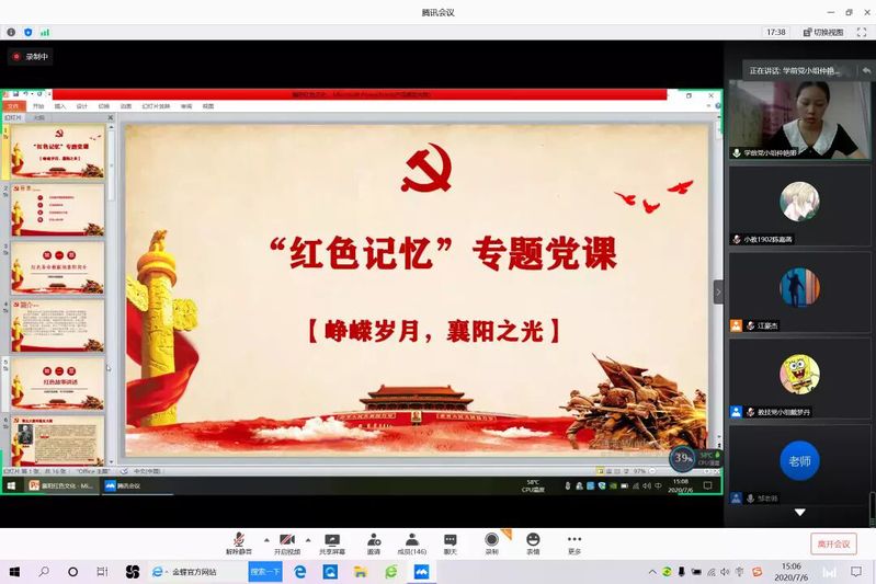 “红色记忆”专题党课活动于7月6日在线上开展,共有150余名学生党员、团员在线观看,专题党课由学生党支部各党小组负责主讲,王苗、仲艳丽、田员圆3名同志分别代表小教、学前、教技3个党小组,以《寻找宜昌记忆,传承红色基因》、《峥嵘岁月,襄阳之光》、《忆英雄楷模,扬洪湖精神》为题,围绕着自己的家乡,探寻家乡的“红色记忆”,三名同志从红色奋斗故事、重要红色景点和模范先进党员三个方面以“ppt展示+讲述”的形式向与会人员讲述家乡的革命历史。活动结束后,与会人员谈及自己的感想,动情的说:要勿忘历史,缅怀先烈,要深刻认识到红色证政权来之不易,新中国来之不易,深刻理解中国共产党为什么“能”、马克思主义为什么“行”、中国特色社会主义为什么“好”,不断从中汲取前进力量,增强“四个自信”做到不忘历史,不忘初心,知史爱国,知史爱党!
