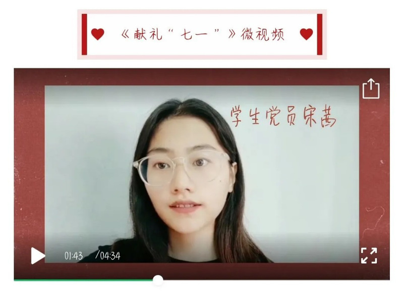 在“七一”前夕,学生党支部组织学生党员、入党积极分子、共青团员一道录制《献礼“七一”》微视频,该视频于建党节当天在支部微信公众号上推送,视频内容主要围绕学生党员、入党积极分子、共青团员三种不同政治风貌的青年学子,给予党的99周年华诞美好的祝愿。视频推出后在学生群体中引起极大的反响,当天观看转发近2000余次,极大的激发了广大青年学子的爱党爱国爱社会主义的拳拳之心,纷纷表示以共产党员标准严格要求自己,勇于承担起时代责任,用自己的行动筑造盛世气象、锦绣中华。