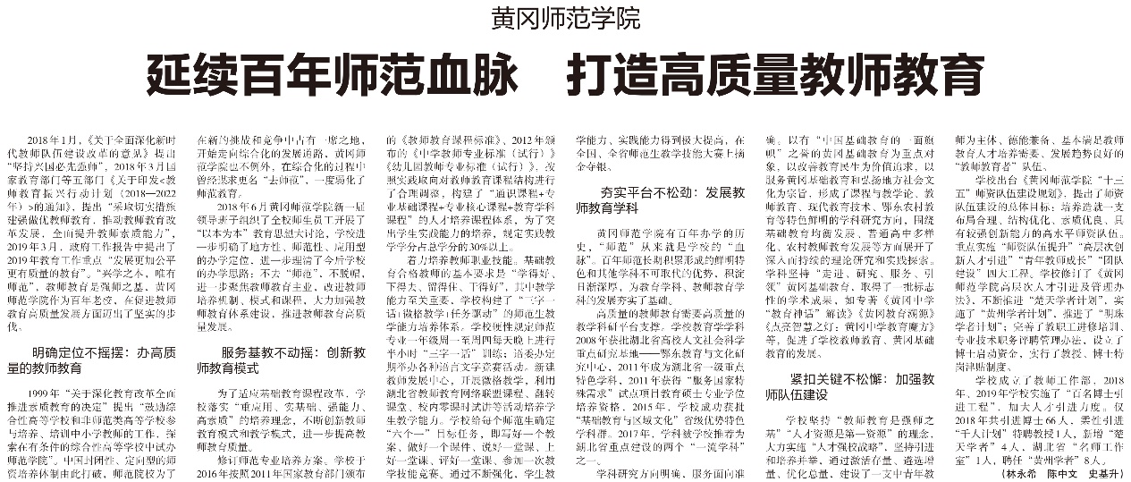 厚重的师范教育历史为我校教育学科的发展奠定了坚实的基础,经历多年改革创新与发展,现教育学院已发展成为湖北省重要教育智库和师范生培养重地,在鄂东、全省乃至全国基础教育界享有盛誉。学院设有教育技术学、数字媒体技术、学前教育、小学教育4个本科专业,现有在校生1500余人;教育管理、现代教育技术2个教育硕士专业学位点,是我校首批开始招收研究生的教育硕士专业学位点,已招收9届研究生,3位教师获得全国教育硕士优秀教师和教学管理工作者荣誉称号。