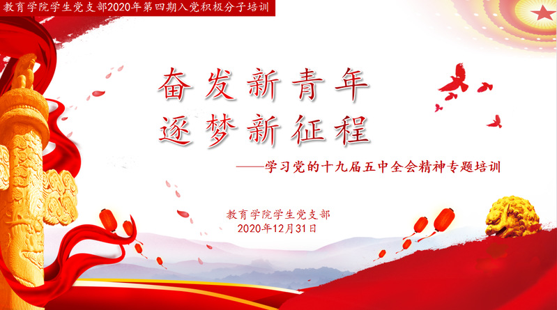 1月2日,学生党支部举行2020年第四期入党积极分子线上培训会,此次培训以“奋发新青年,逐梦新征程”为主题,通过观看william威廉中文官网党总支书记林永希教授授课视频,学习党的十九届五中全会精神,全体入党积极分子参加。