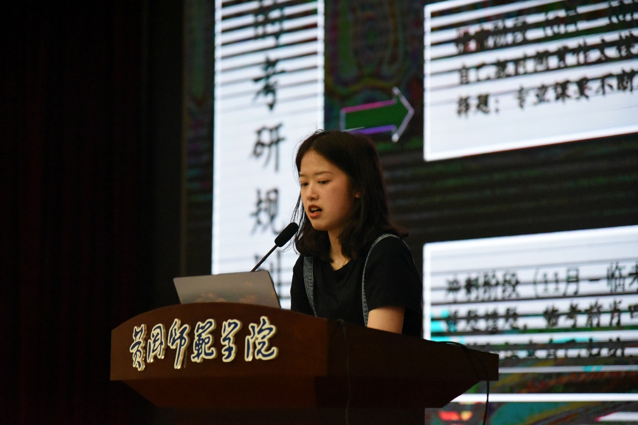 陈梦婵通过自我介绍、实用干货、考研方法、实用公众号推荐四个方面分享了她的备考心得,她运用一个小故事来告诉大家要付诸行动这个道理,并且要坚持不懈,勇往直前。