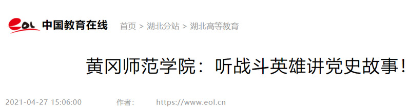 党史学习教育开展以来,教育学院学生党支部邀请我校有着76年党龄、曾获得5枚国家级勋章的共产党员——离休老校长陈志忠,为全体党员和积极分子讲述党史故事。该活动被《湖北高校思政网》《中国教育在线》《人民网》等多家媒体报道。
