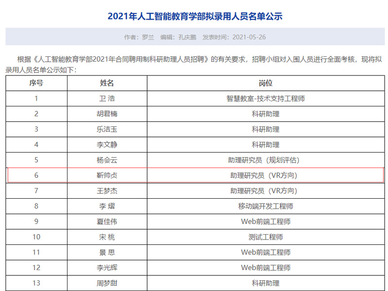 5月26日,从华中师范大学人工智能教育学部传来喜讯,我校教育学院2019级研究生靳帅贞在层层选拔后脱颖而出,顺利通过了重重考核,被华中师范大学人工智能教育学部录用为VR方向助理研究员。从此,我校教育学院已有20余名学子踏上高端就业之旅。