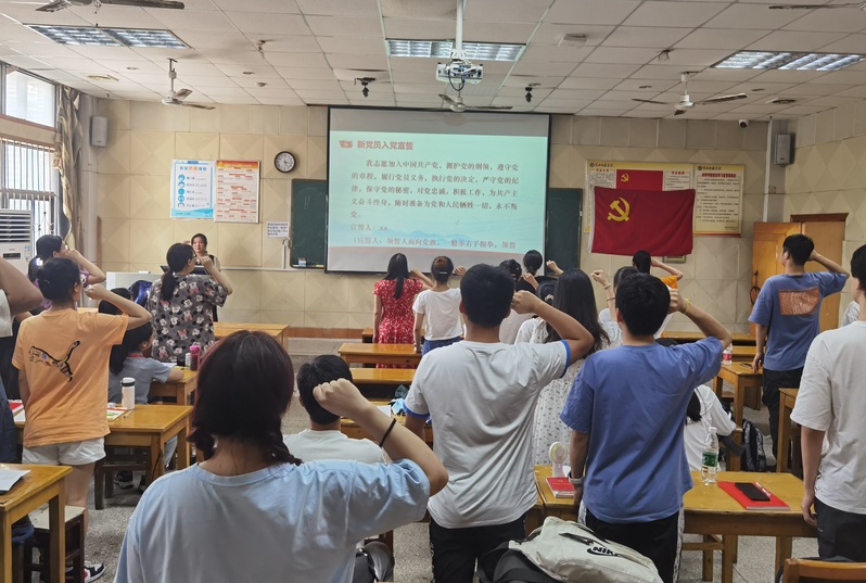 为庆祝中国共产党成立100周年,深化党史学习教育,增强新党员加入党组织的仪式感和荣誉感,大力营造爱党信党跟党走的浓厚氛围,2021年6月17日下午,学生党支部举行新党员入党宣誓仪式暨重温入党誓词活动,全体在校党员参与,学生党支部书记邹老师主持仪式。