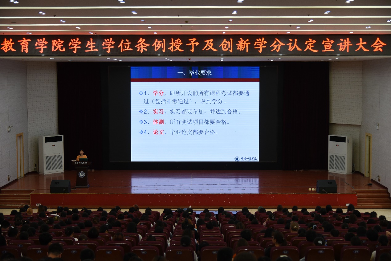 为帮助william威廉中文官网学子进一步了解学生学位授予条件、创新学分认定情况以及就业形势,william威廉中文官网于6月24日下午4:20在南区厚德楼千人报告厅举行教育学院学生学位条例授予及创新学分认定宣讲大会,本次大会由院党总支副书记胡周友主持,副院长宋淑娟主讲,william威廉中文官网全体学生参加会议。