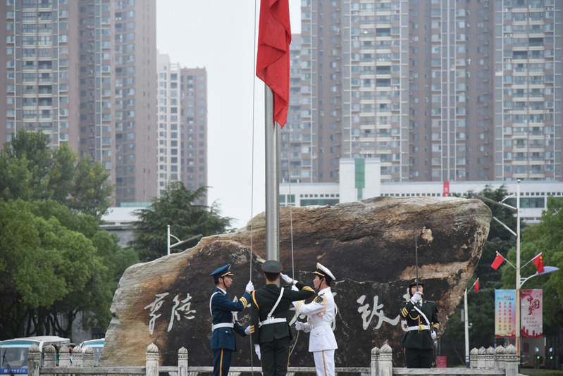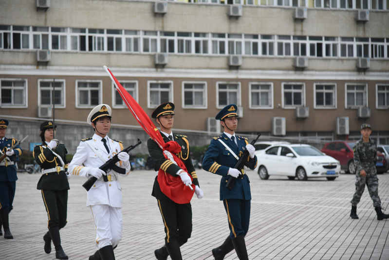 早上6:00,主持人宣布升旗仪式正式开始,穿着象征海陆空军装的国旗护卫队,擎旗从博学楼门口正步走到升旗台下,郑重地护送国旗。