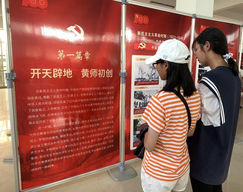 在王书记和卢老师的带领下,同学们整齐有序地参观主题展。本次主题展主要讲述了新中国成立后100年来的发展历史以及黄冈师范学院在党的领导下一步步发展壮大起来的过程,让同学们看到了黄师人锐意进取、自强不息的精神,领略到了跟随中国共产党的重要性与必然性。