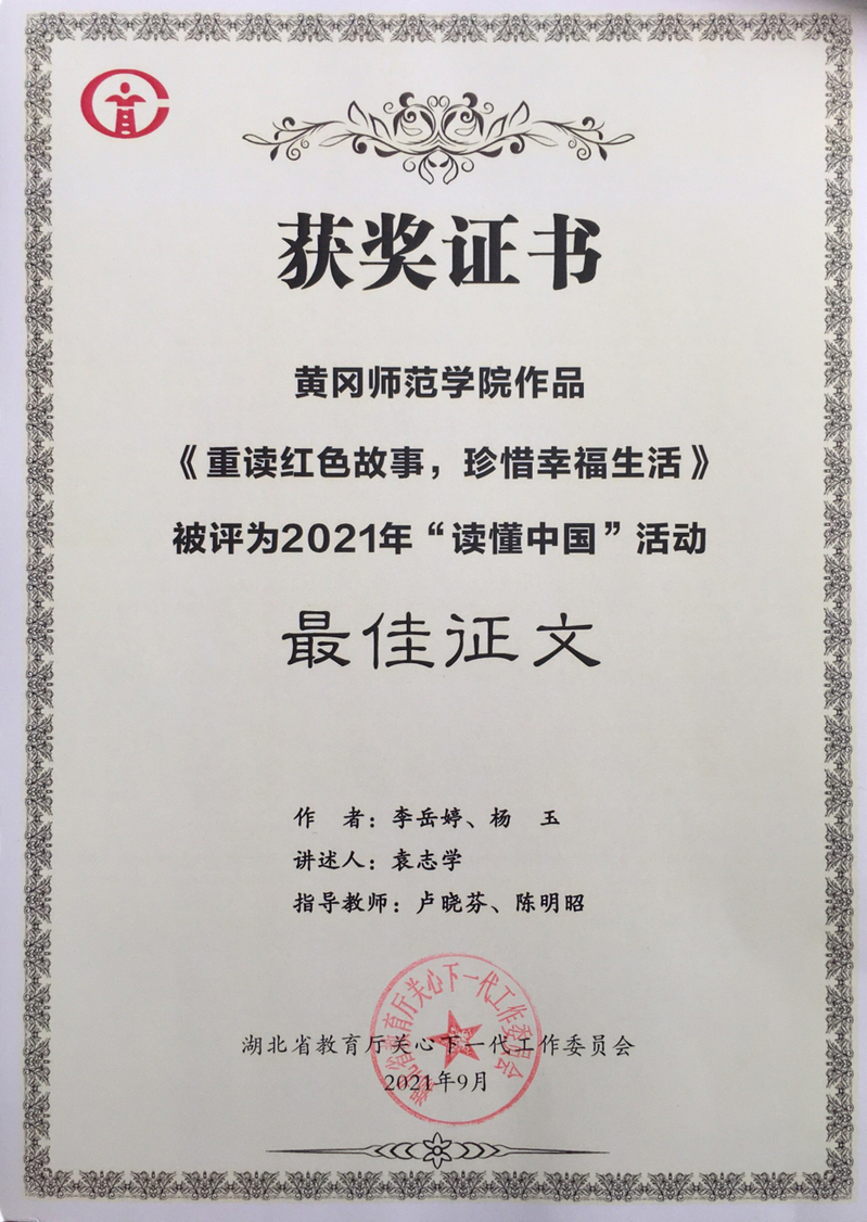 教育部关工委发布《关于公布2021年“读懂中国”活动评审结果的通知》(教关委函〔2021〕10号),william威廉中文官网选送的作品《重读红色故事,珍惜幸福生活》由william威廉中文官网学前1802班李岳婷同学、杨玉同学共同创作完成并被评为2021年“读懂中国”活动“最佳征文”。卢晓芬老师精心组织、指导该活动。