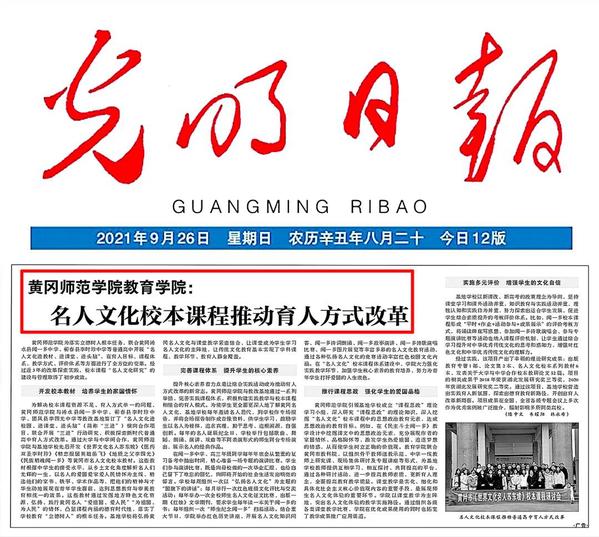 本网讯 9月26日,《光明日报》第04版以《名人文化校本课程推动育人方式改革》为题,从“开发校本教材 培养学生的家国情怀”“完善课程体系 提升学生的核心素养”“推行课程思政 强化学生的爱国品格”“实施多元评价 增强学生的文化自信”四个方面报道了我校联合黄冈浠水县闻一多中学、蕲春县李时珍中学等普通高中开展“名人文化进教材、进课堂、进头脑”,校本课程“名人文化研究”的建设与管理取得的初步成效。