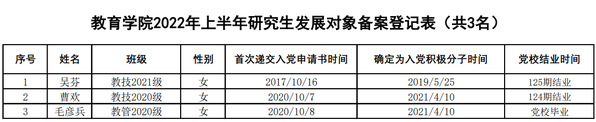 根据学校《关于做好2022年上半年发展对象确定和备案工作的通知》文件要求,学生党支部广泛征求班级群众座谈意见、班主任意见、辅导员意见,学院活动参与情况,吴芬等3名入党积极分子初步符合组织发展要求,经学生支部讨论推荐,报学院党委备案审批同意,具体名单如下: