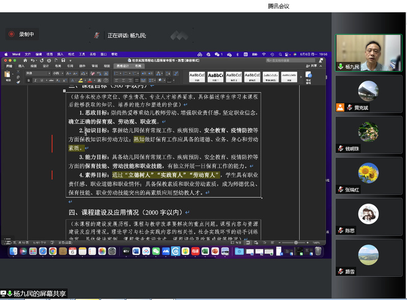 杨九民教授结合实践课程、线上课程、线上线下混合课程等三个类型的《幼儿园保育与劳动实践》《大学生心理健康教育》《信息技术课程教学论》《中学生心理学》等四门省级一流课程申报书,就省级一流课程申报过程中的基本信息、教学团队、课程目标、课程建设及应用情况、课程特色与创新、课程建设计划等内容一一进行了详细的点评和指导。