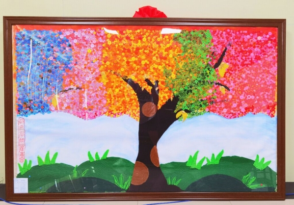这幅作品名为《春华秋实》,作品中的每一粒扣子代表每一位学子,一枝一叶汇聚成郁郁葱葱的扣子树。在教育学院这棵大树的养育恩泽下,正散发着属于自己的不同的光芒。大树颜色蓝到红,寓意从橙黄橘绿到春华秋实,老师们立德树人,润物无声;学子们青出于蓝,红胜似火。草木深深,思念沉沉,学子们对教育学院的深情眷念化作一缕缕丝线,在未来平凡的日子里生根发芽,茁壮成长。