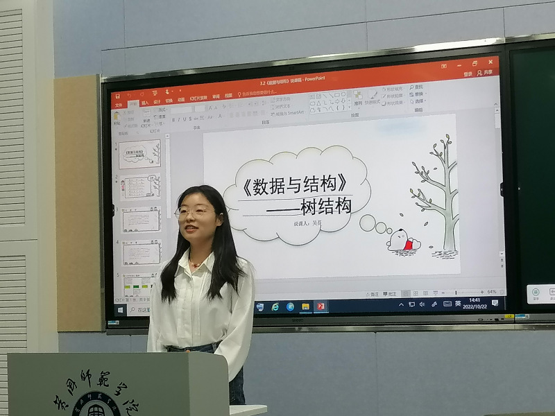 教技21级的吴芬同学,讲课时积极互动,气氛活跃。在讲到《数据与结构》中知识点的时候,充分结合生活实际,以家庭关系图来类比数据结构中的树结构,让大家能更具体的去理解抽象知识,体现了较强的教学设计功底。