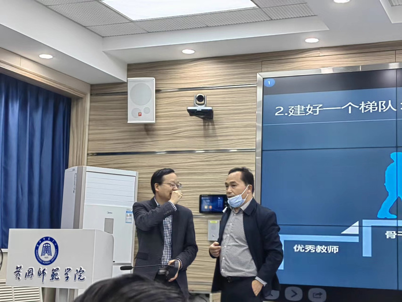 雷中怀简要回顾了自己学习三个专业:思政专业、汉语言文学专业、果树专业的心路历程。强调了党的教育方针是教育必须为社会主义现代化建设服务,必须与生产劳动相结合。雷中怀立足黄冈师资现状:享有“荆楚教育名家”称号6人;国务院津贴专家4人;进入教育部领航工程名单2人等等,重点说明了当代教师队伍建设新局面应从激励、补充、培养、关爱以及考核五大方面的工作机制展开。