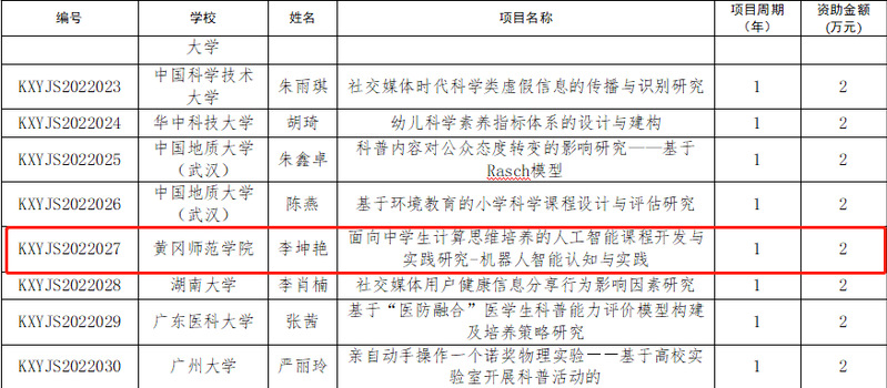 KXYJS2022027 | 黄冈师范学院 | 李坤艳 | 面向中学生计算思维培养的人工智能课程开发与实践研究-机器人智能认知与实践 | 1 | 2 |