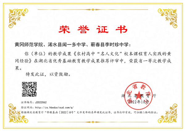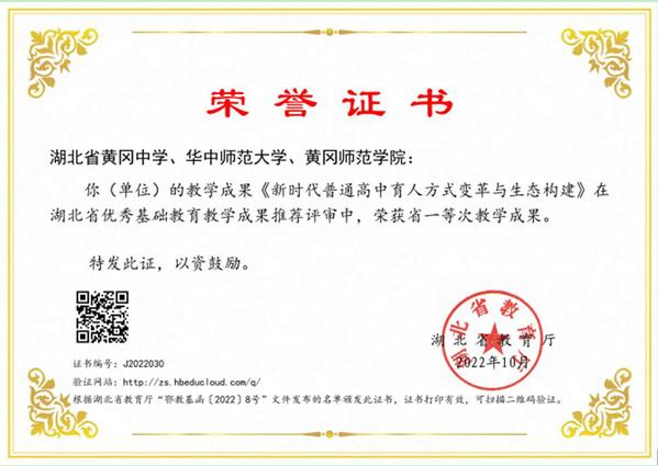 我校教育学院陈中文教授主持的《农村高中“名人文化”校本课程育人实践的黄冈经验》和湖北省黄冈中学刘折谷校长主持、我校参与的《新时代普通高中育人方式变革与生态构建》两项成果获一等奖,教育学院专职引进的特级教师张志勇以蕲春县蕲州镇实验小学为主持单位与我校联合申报的《基于立德树人的“动感德育”体系构建与实践创新》获二等奖。两项一等奖成果被推荐参加2022年基础教育国家级教学成果奖评选。《农村高中“名人文化”校本课程育人实践的黄冈经验》以习近平在全国教育大会上提出的“六个下功夫”为培养目标,以浠水闻一多中学、蕲春李时珍中学等10所以名人命名的普通高中为教学改革基地,联合开展“名人文化进校园、进课堂、进头脑”行动研究,将U-S合作模式融入中华优秀传统文化的传承弘扬中,在合作、共赢中推动优秀文化进校园,通过明确育人目标,提炼“名人化人”精神内涵;创新课程体系,构建“名人文化”课程系统;开展丰富活动,搭建“名人文化”活动载体;创设文化环境,营建“名人文化”学习氛围;落实多元评价,创新“名人文化”学习激励机制;打造管理平台,创建“名人文化”教育共同体,促进学生全面发展,促进教师专业发展,促进学校特色形成,构建起农村高中“名人文化”校本课程开发与实践的新模式和新机制,取得了明显成效。