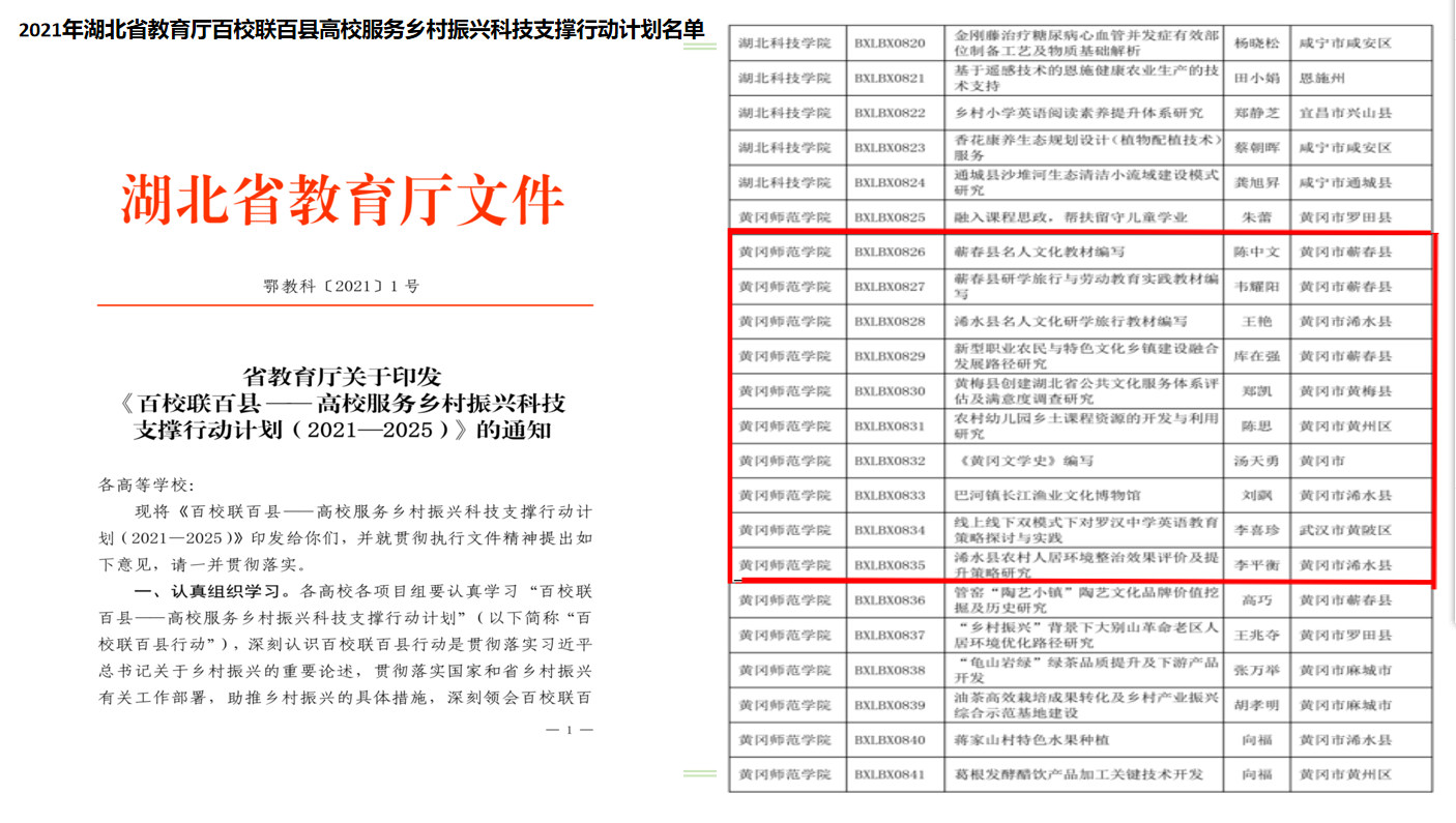 服务地方的过程中,教育学院持续深化产教融合,充分发挥地质学、教育学与管理学等学科优势,联合黄冈市自然资源局、黄冈大别山世界地质公园等单位积极申报省部级研究课题,撰写智库报告。以教育学院科研团队为核心的课题组成功申请了湖北省教育厅《百校联百县一高校服务乡村振兴科技支撑行动计划( 2021- 2025)》》4项,湖北省社科联的中国调查课题《湖北省县域经济高质量发展调查》,湖北省自然资源厅的科研课题《国家地质公园资源环境合作开发与协同治理研究》。