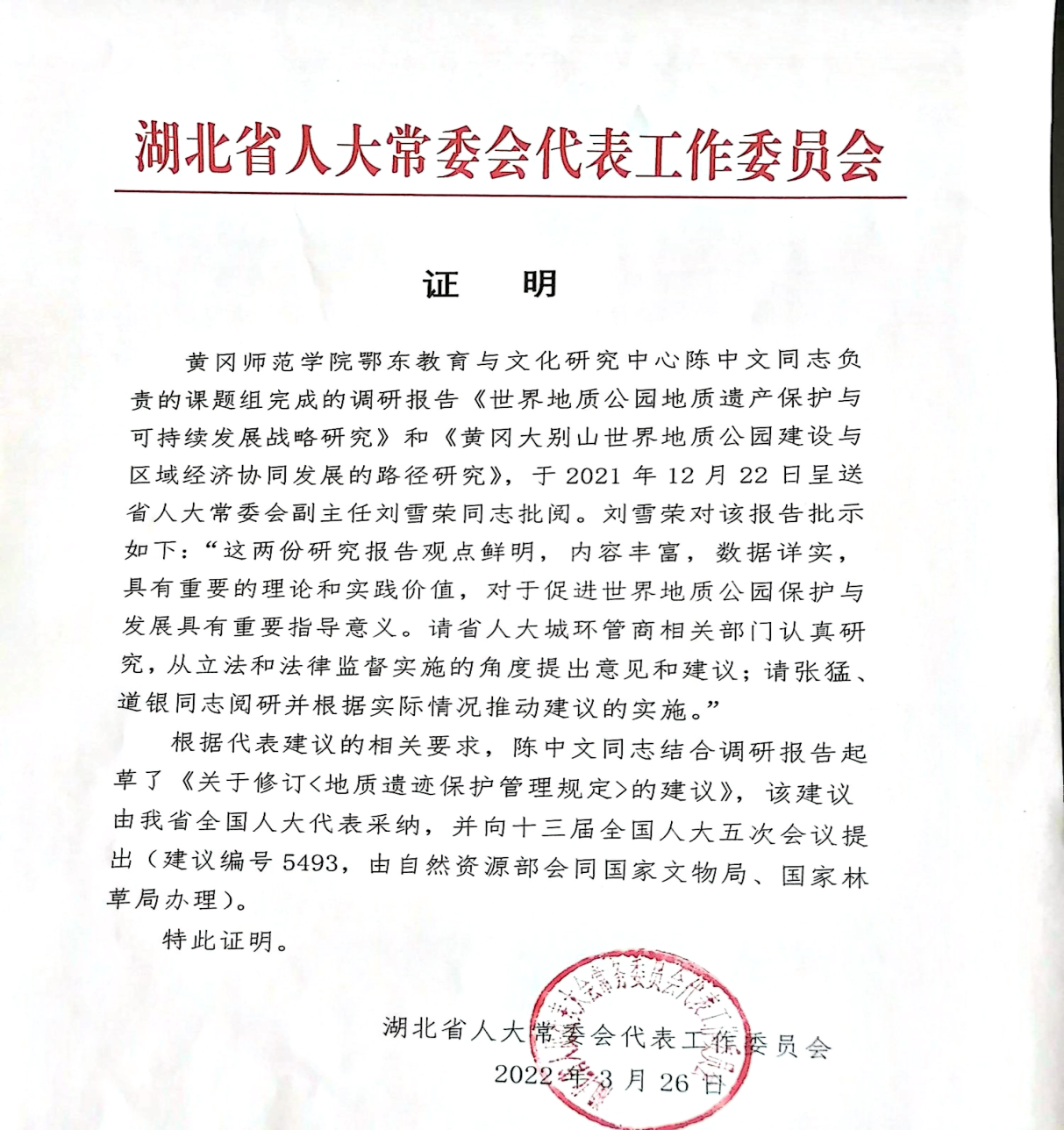 该成果被湖北省人大常委会代表工作委员会采纳应用,并且提供了采纳证明。意见如下:“根据代表建议的相关要求,陈中文同志结合调研报告起草了《关于修订<地质遗迹保护管理规定>的建议》,该建议由我省全国人大代表采纳,并向十三届全国人大五次会议提出(建议编号5493, 由自然资源部会同国家文物局、国家林草局办理)。