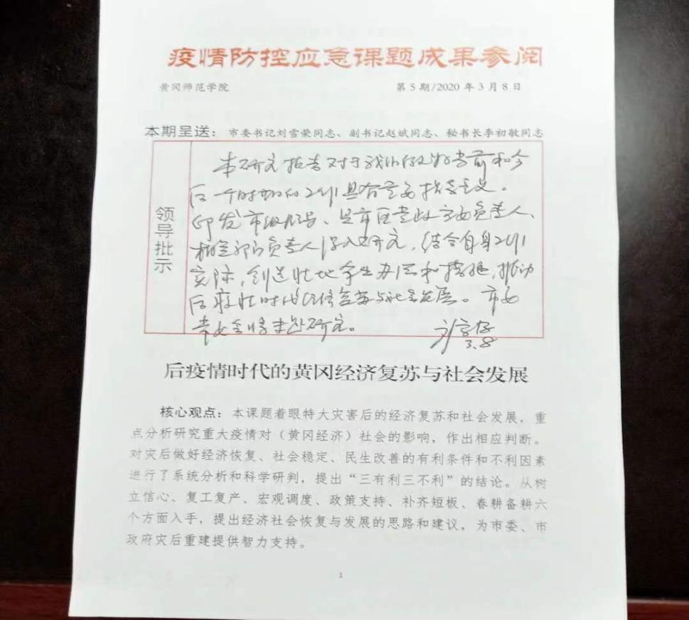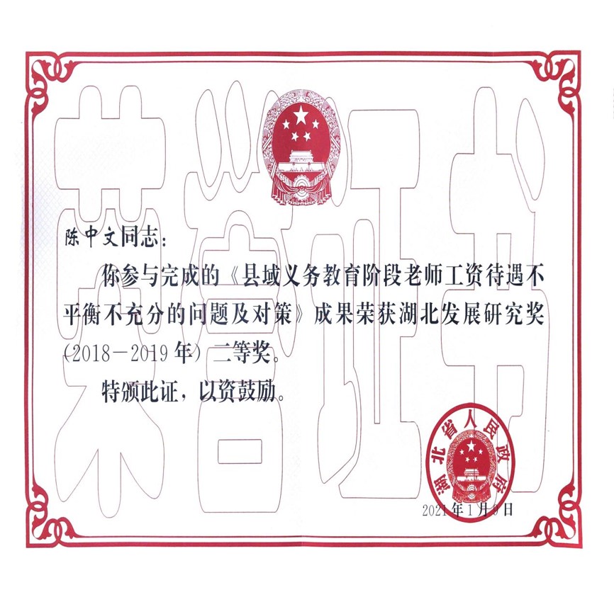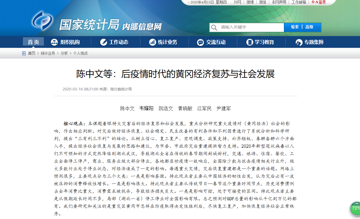 陈中文撰写的智库报告《后疫情时代的黄冈经济复苏与社会发展》成果获湖北省人大常委会副主任刘雪荣批示(2020.3.8):“本研究报告对于我们做好当前和今后一个时期的工作具有重要指导意义。印发市级领导、县市区党政主要负责人、相关部门负责人深入研究,结合自身工作实际,创造性地拿出办法和措施,推动后疫情时代经济复苏与社会发展。市委常委会将专题研究。”《国家统计局》官网(2020.3.16)以“陈中文等:后疫情时代的黄冈经济复苏与社会发展”为题全文刊载。《湖北省统计局》官网(2020.3.10)以“黄冈:后疫情时代的黄冈经济复苏与社会发展”为题全文刊载。《中国教育在线》(2020.3.14)以“黄冈师范学院课题成果助力黄冈市疫后复苏”为题,摘要报道。《黄冈新闻网》(2020.3.14)以“黄冈师范学院课题成果助力黄冈市疫后复苏”为题,摘要报道。《长江云》(2020.3.15)以“黄冈师范学院课题成果助力黄冈市疫后复苏”为题,摘要报道。《荆楚网》(2020.3.16)以“黄冈师范学院课题成果助力黄冈市疫后复苏”为题,摘要报道。