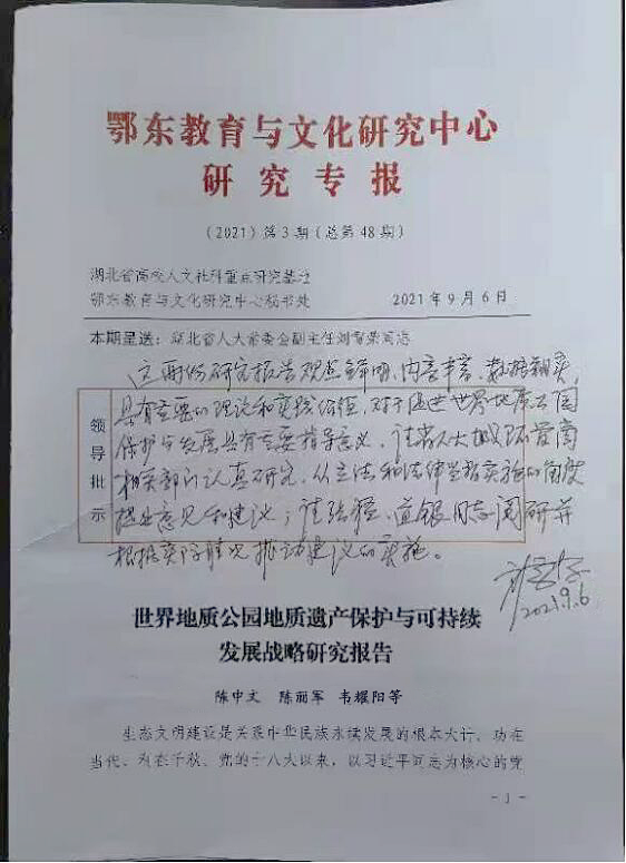 教育学院课题组《世界地质公园地质遗产保护与可持续发展战略研究》研究专报得到湖北省人大常委会副主任刘雪荣高度评价。批示意见:“这两份研究报告观点鲜明,内容丰富,数据翔实,具有重要的理论和实践价值,对于促进世界地质公园保护与发展具有重要指导意义。请省人大城环管商相关部门认真研究。从立法和法律监督实施的角度提出意见和建议;请张猛、道银同志阅研并根据实际情况推动建议的实施。”