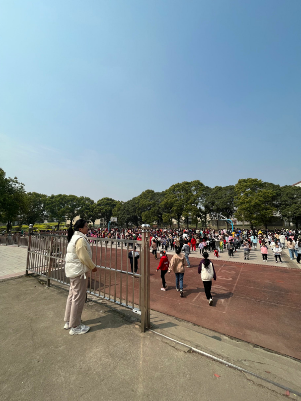 两位实习生参与学生升旗,大课间体操活动等