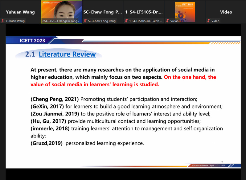 在此次EI国际会议上,杨航琳同学作了题为“Research on the Auxiliary Function and Mechanism of Social Media for Postgraduate Curriculum Learning ——Qualitative Analysis Based on Grounded Theory”(指导教师:陈中文教授)的学术汇报;王娱欢同学作了题为“Research on the Current Situation of Data Literacy and Improvement Strategies of County Middle School Teachers——Based on the Survey of 10 Counties and Cities in Huanggang, Hubei Province”(指导教师:李威教授)的学术汇报。