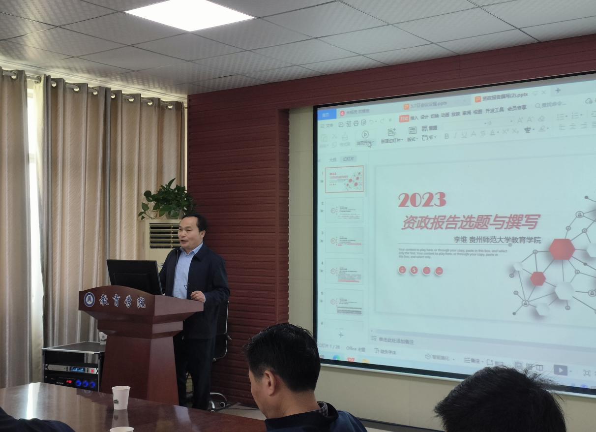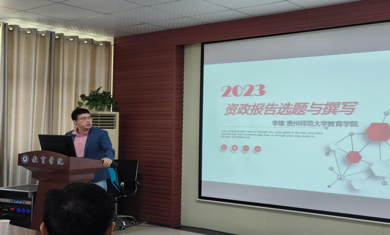 上午的论坛由陈院长主持,他首先代表全院师生向各位学者的到来表示衷心的欢迎和感谢。随后,贵州师范大学教育学院副教授、厦门大学教育学博士后李维老师做了题为《强化问题导向,写好资政报告》的分享,在报告中,他分别从资政报告的选题、分类、结构格式、提交渠道等方面进行了深入展开,强调了资政报告的针对性、真实性和时效性。在互动环节中,陈院长和韦耀阳老师从自身科研实践中提出相应问题,与李维老师进行了一场深刻的学术探讨。