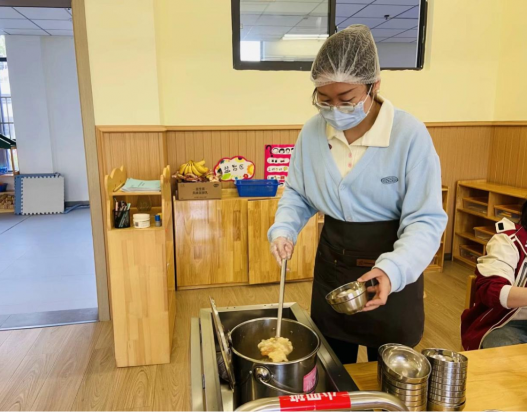 幼儿进餐环节,实习生们积极配合保育老师们的工作,分发餐具、清理桌面、指导幼儿握餐具的姿势等,在餐前我们还会让小朋友们邀请本班的实习老师讲绘本故事,拉进师幼间的距离,让小朋友们和实习老师更快熟悉对方。