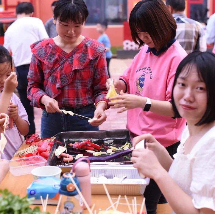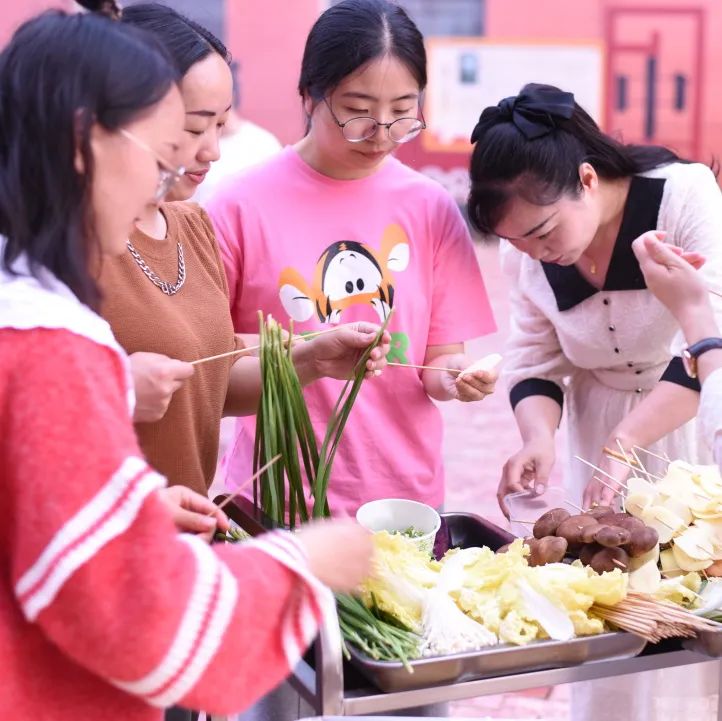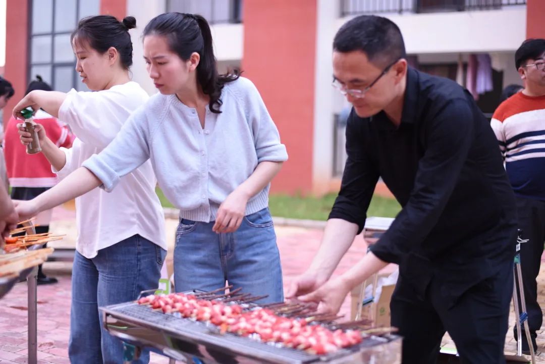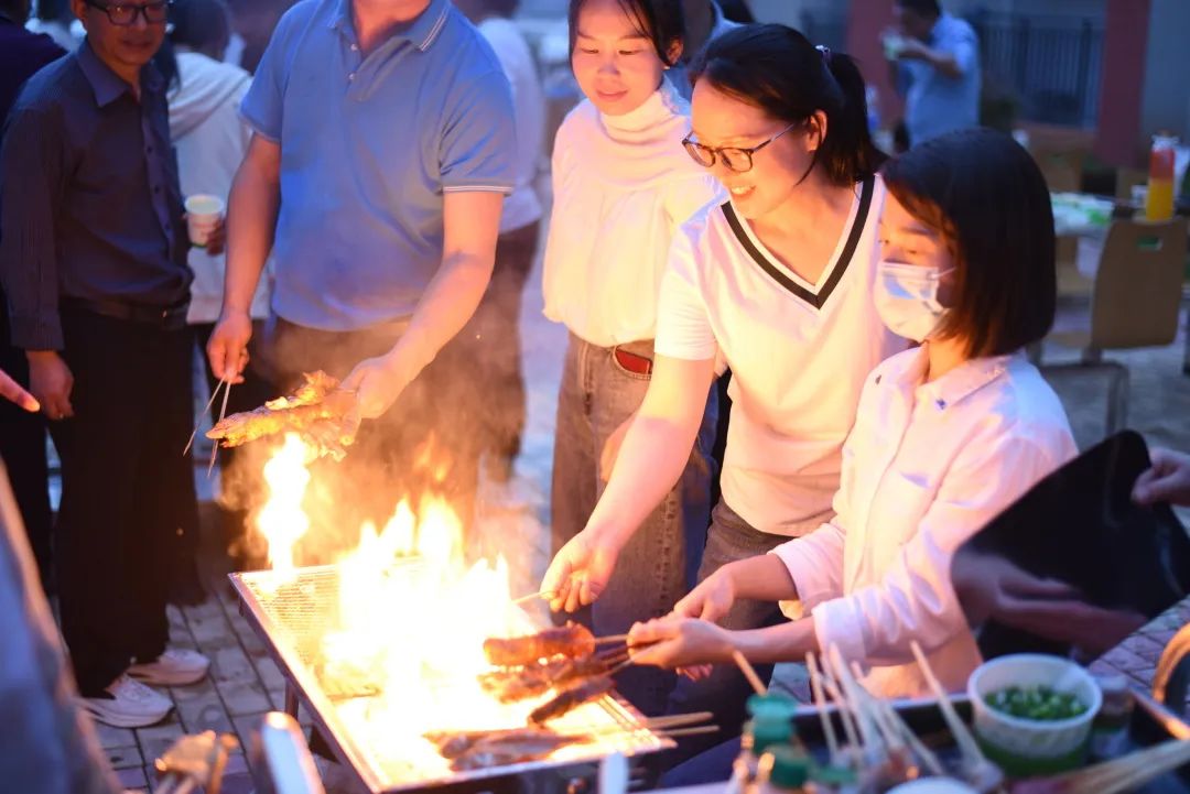 忆往昔峥嵘岁月,看今朝风华正茂。5月4日晚上,黄梅县岳飞小学开展了“展岳小风采,谱青春华章”“五·四”青年节教师大联欢活动。活动内容包括自助烧烤和节目表演两部分。全体校领导及教师近百人参加。当天下午放学安全送孩子们离校后,全体老师集中到校内指定位置,以年级为单位自成一组。组装烤炉,准备食材,烧炭生火,刷油翻烤……大家各司其职,井然有序,烟火气与欢乐之气同生共溶。