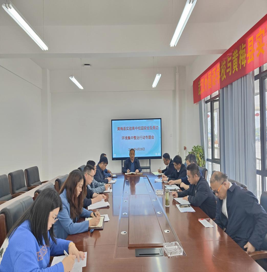 4月28日下午,黄梅县实验高级中学召开校园安全及周边环境集中整治行动专题会,会议由支部书记、校长柳亚飞主持,班子成员和各年级处、政教处、保卫处负责人参加会议。