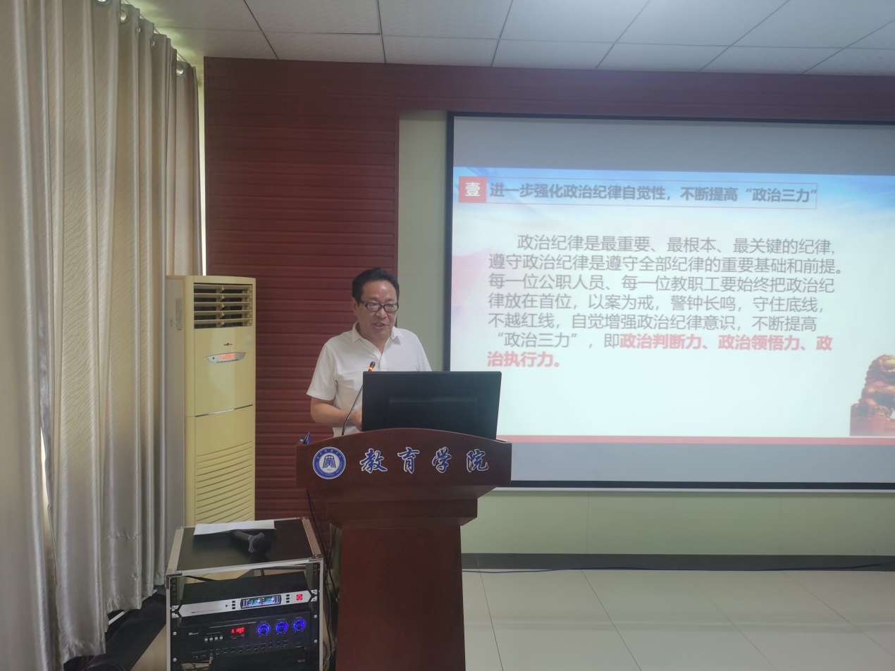 党委书记刘杰传达学校会议精神、并以《增强纪律自觉,知重负重担重》讲授廉政党课,他从进一步强化政治纪律自觉性,不断提高“政治三力”;进一步强化工作纪律自觉性,不断增强“岗位三责”;进一步强化作风建设自觉性,不断增强决胜决战斗志三个方面要求全体教职工,保持好优良师风品质,以高尚的品德致力于立德树人,投身于我们教育学院事业发展,团结和睦,协同共进,为圆满完成2023年度目标任务而踔厉奋发、再添新功。