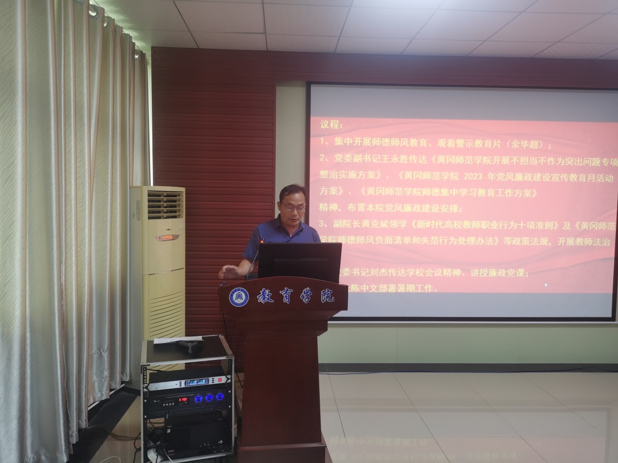 副书记王永胜传达《黄冈师范学院开展不担当不作为突出问题专项整治实施方案》、《黄冈师范学院 2023 年党风廉政建设宣传教育月活动方案》、《黄冈师范学院师德集中学习教育工作方案》精神,布置本院党风廉政建设安排。