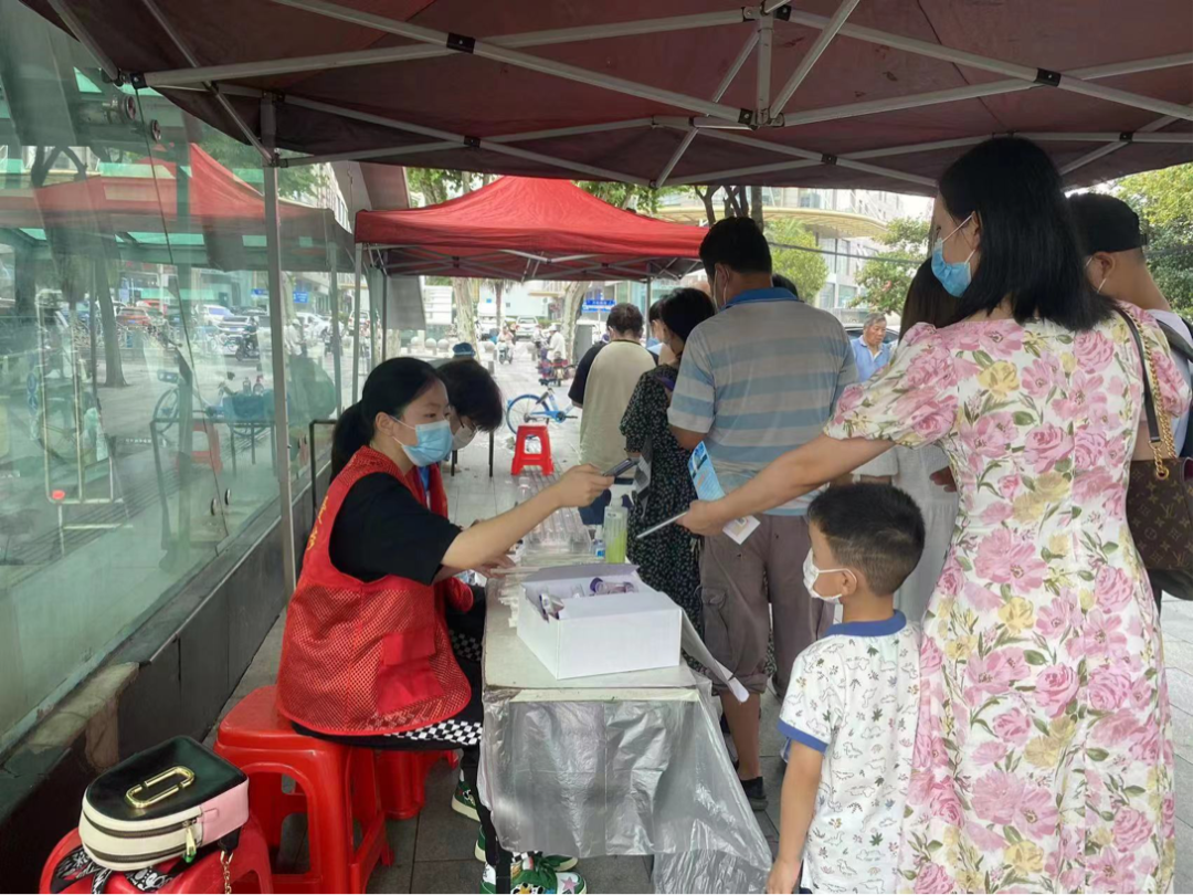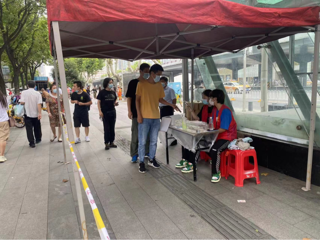 (图为社区工作人员搭建的临时检测篷居民们自觉的有间距的排队)