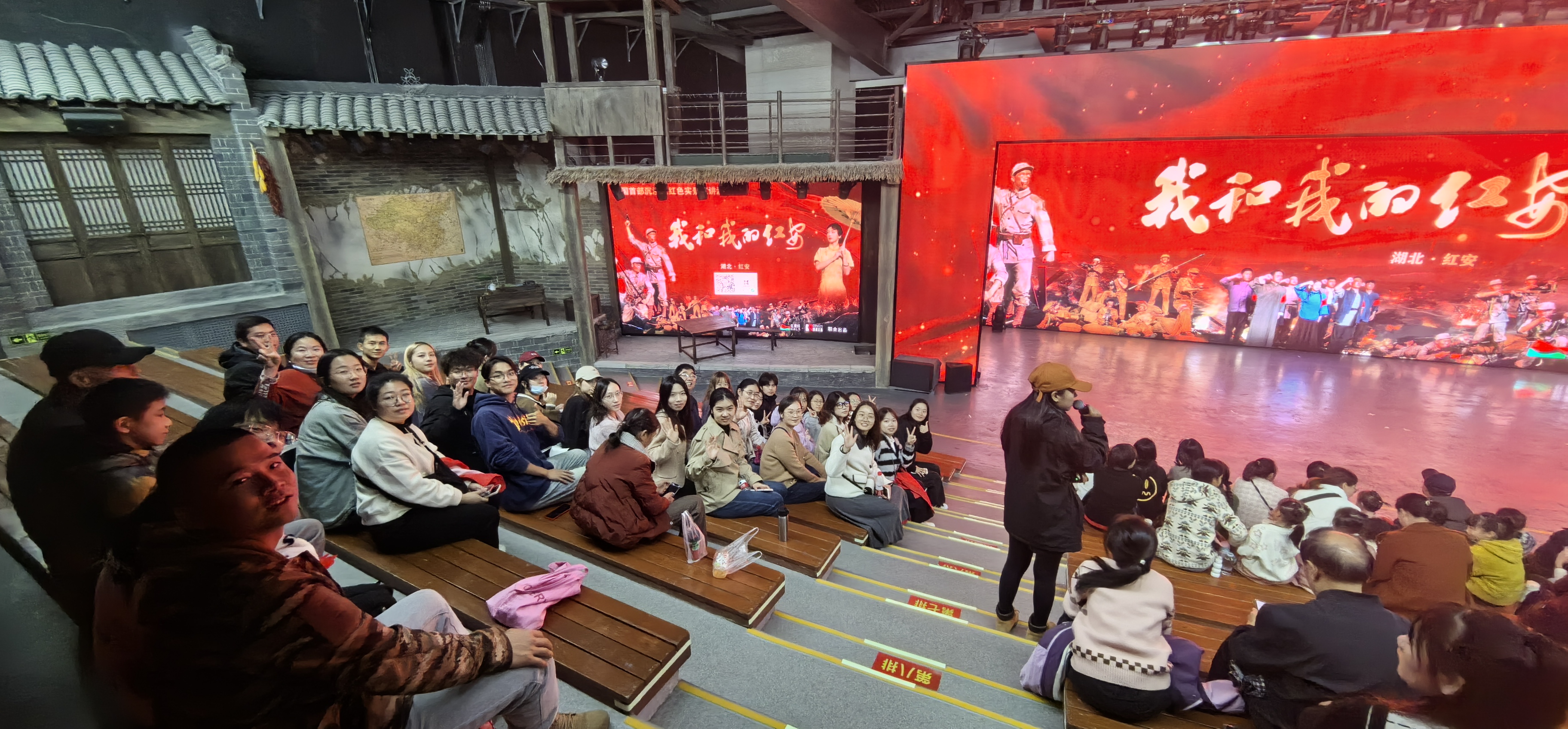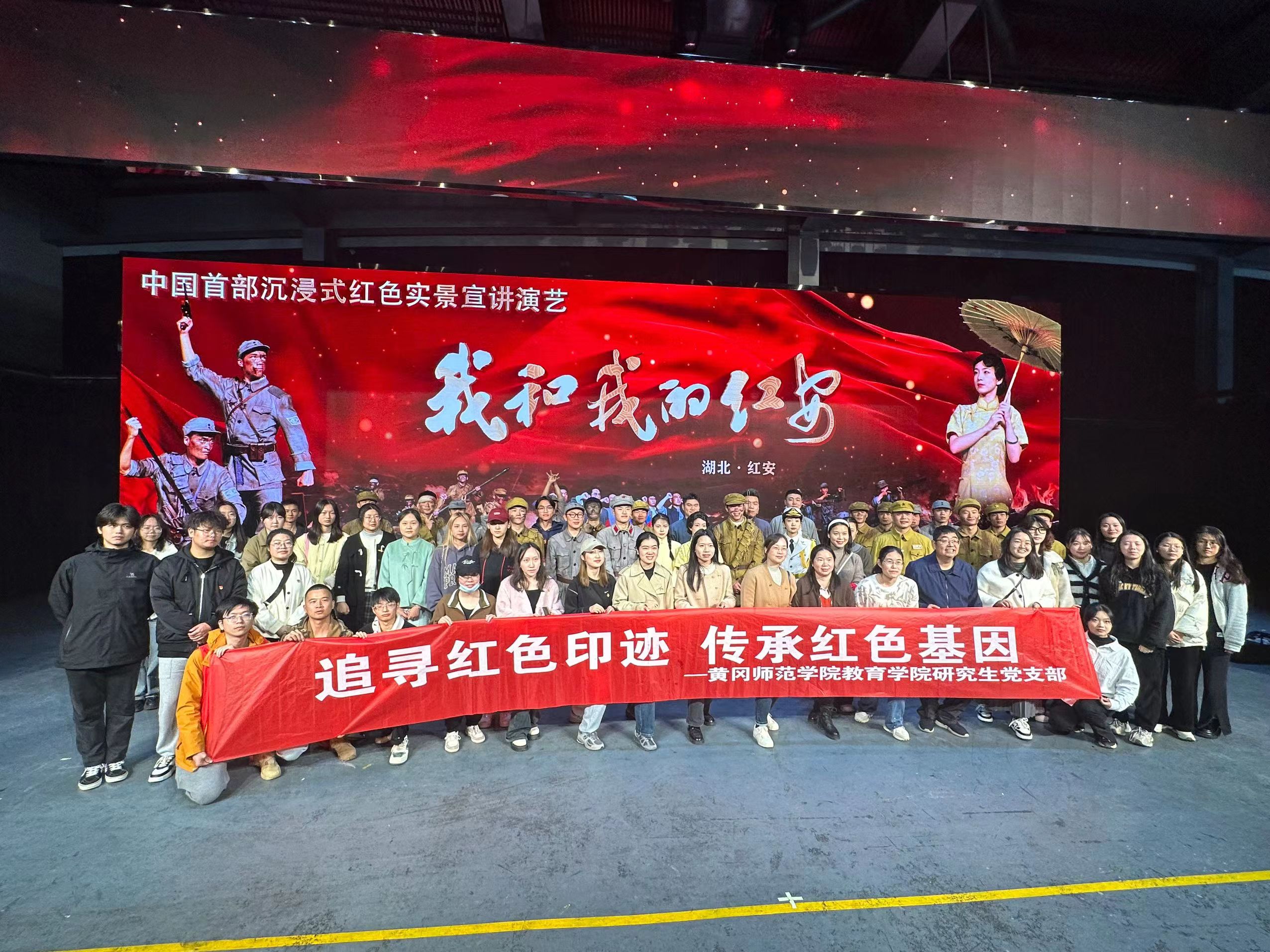 下午3:20,教育学院研究生党支部师生党员一行来到黄麻起义和鄂豫皖苏区纪念园旁的红色剧院集体观看中国首部沉浸式红色实景宣讲演艺《我和我的红安》。该剧目是一部以革命历史和红色文化为主题的演出,通过生动的故事情节、场景还原和演员表演等手段,让观众身临其境地感受那段峥嵘岁月的革命历程和英雄事迹。这种沉浸式的体验可以让党员们更加深入地了解党的历史和传统,增强他们的爱国主义情感和党性意识。在剧中,通过讲述革命先烈们的英勇奋斗故事,弘扬了共产党人的革命精神和崇高理想,同时也揭示了革命斗争的艰辛和牺牲。这种宣讲形式激发师生党员们的革命热情和斗志,帮助他们更好地理解和践行党的路线方针政策。