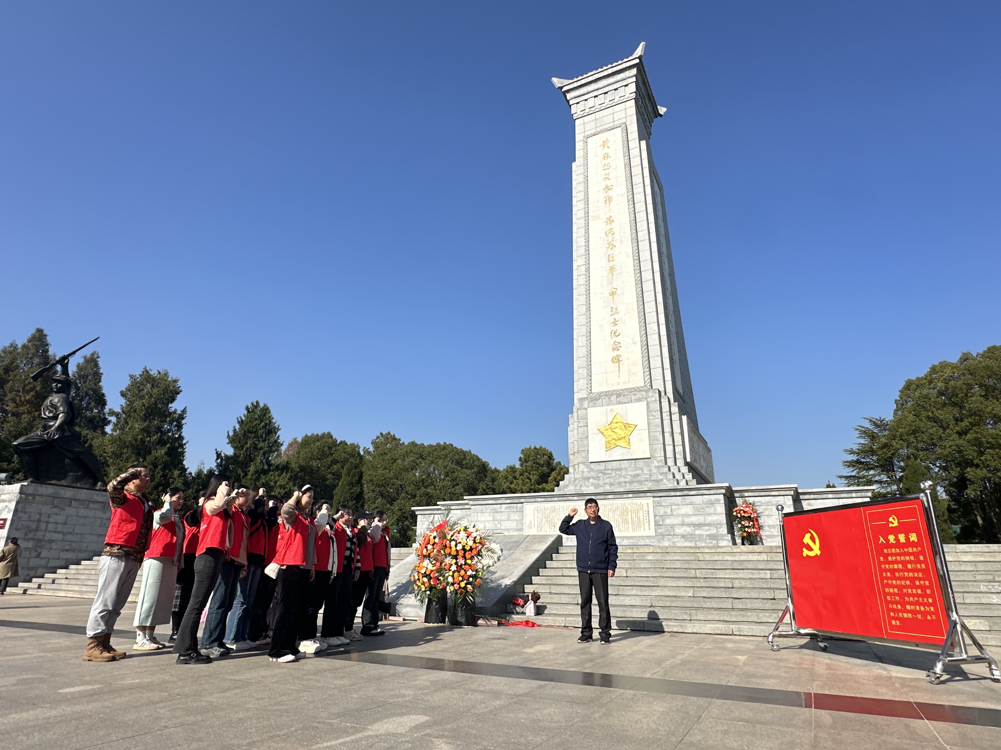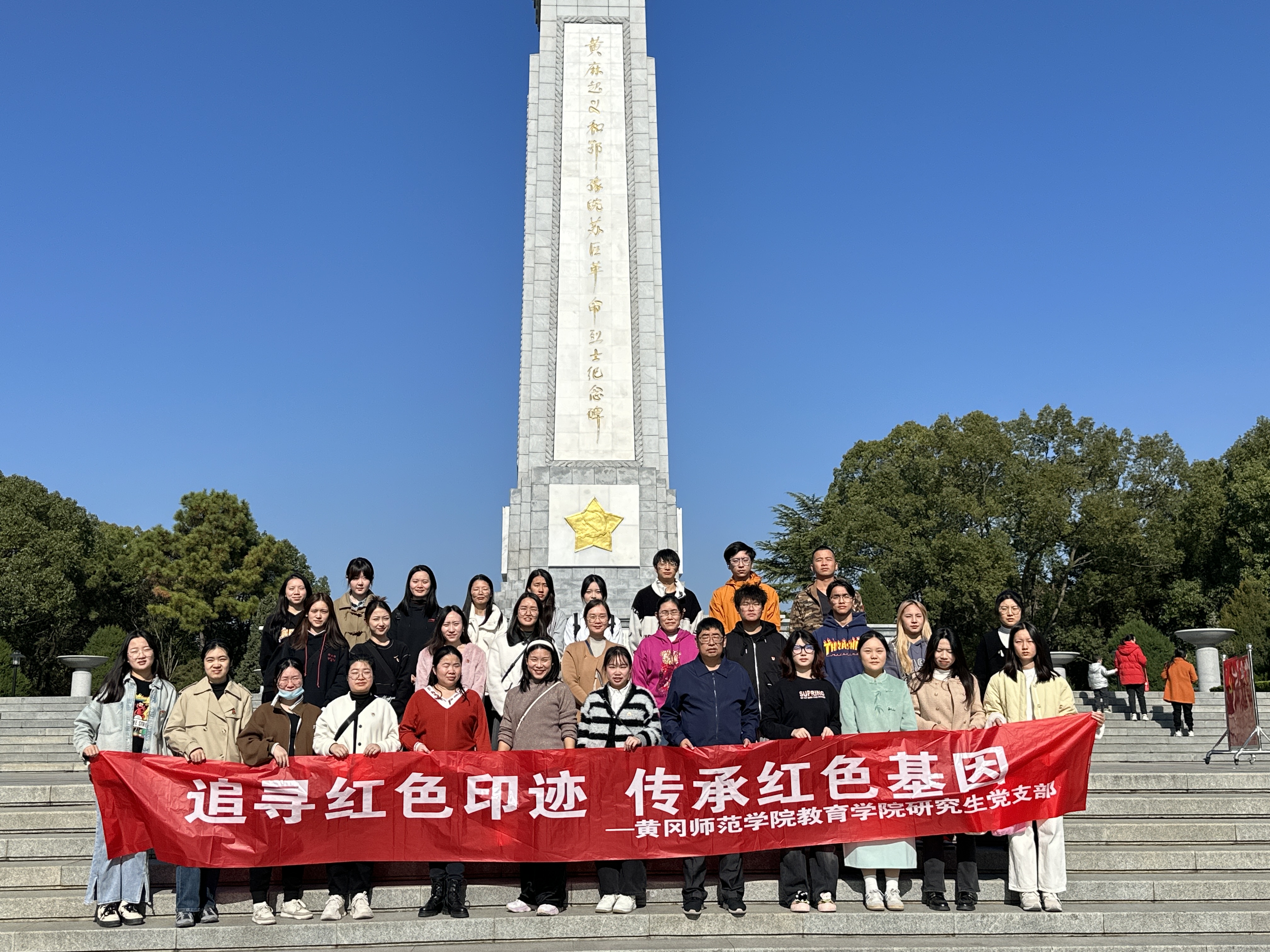 在纪念碑前,教育学院研究生党支部师生党员整齐列队,气氛庄重肃穆,在教育学院研究生党支部书记韦耀阳的带领下重温入党誓词。随后,大家一起瞻仰纪念碑,重温黄麻起义的历史背景和过程,感受那段英勇悲壮的革命岁月。