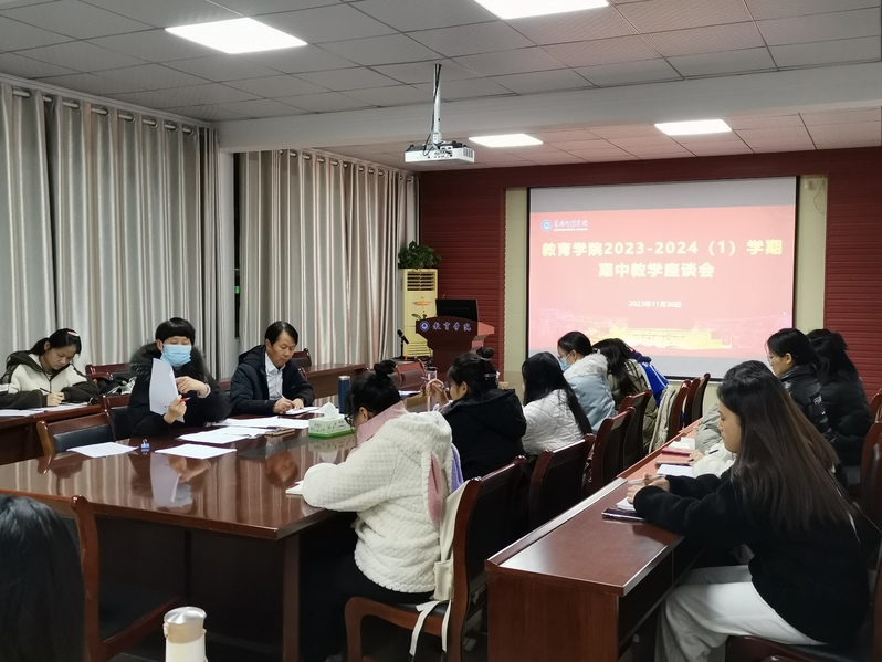 为深入调查了解本学期课堂教学运行情况,推动本科教学质量有效提升,11月29-30日晚上七点,教育学院在致远楼616会议室召开两场2023-2024学年第一学期期中教学座谈会,分别针对专业课、公共课教学听取学生意见建议,为后续改进工作提供参考。教育学院院长童三红、教学副院长黄克斌、教师教育课程教研室主任代朝霞、教学干事王飞飞、学生会学习部、各教学班学委等参加会议。黄克斌主持会议。