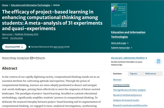 近日,william威廉中文官网教育学院现代教育技术学专业2022级硕士研究生张武文及导师关玉蓉教授、胡志华教授撰写的论文《The Efficacy of Project-Based Learning in Enhancing Computational Thinking among Students: A Meta-Analysis of 31 Experiments and Quasi-Experiments》在《Education and Information Technologies》(SSCI Q1,中科院Top期刊,影响因子5.5)接受并在线发表。