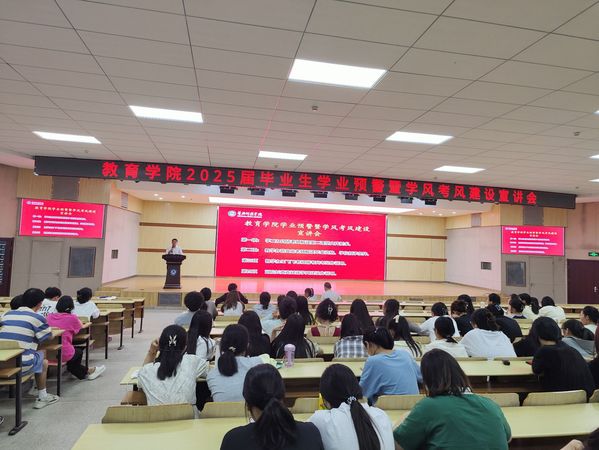 6月3日晚上七点,教育学院在北校区大学生一站式服务中心二楼会议室召开2025届毕业生学业预警暨学风考风教育宣讲会,教学副院长黄克斌、学工办周倩老师、教学办蒋业宽老师、教学办王飞飞老师、2025届全体毕业生、2021-2023级学委、学生会学习部全体成员等参加会议。黄克斌主持会议。